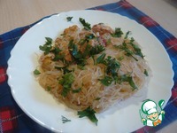 Вливаем 150 мл. воды. Доводим до кипения. В сковороду кладем фунчозу. Выключаем огонь. Накрываем крышкой и оставляем на 5 мин. Все, блюдо готово. |