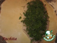 Кусок телапии кладётся на раскатанное тесто, добавляется соль, перец, рубленная зелень. |