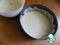 Взяла разъёмную форму D-20 см и застелила её пекарской бумагой. Бумагу промазала подсолнечным маслом. Выложила половину теста на дно. |