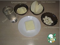 Подготавливаем необходимые ингредиенты. Сыр трем на терке или режем кусочками. Если нет кукурузной муки, можно измельчить кукурузную крупу в кофемолке. Заменять на обычную муку не советую. |