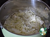 Репчатый лук нарезать четверть кольцами. В кастрюле с толстым дном разогреть подсолнечное масло, выложить в нее репчатый лук, сразу посолить немного и обжарить 3-4 минуты до прозрачности. |