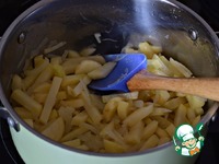 Всыпать в кастрюлю картофель, нарезанный соломкой. Обжарить овощи пару минут. |