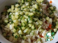 Туда же всыпать нарезанные небольшими кубиками огурцы. |