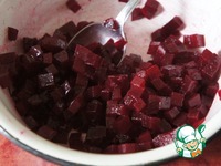 Свеклу также нарезать маленькими кубиками, положить в отдельную миску, добавить немного растительного масла и хорошо перемешать. |