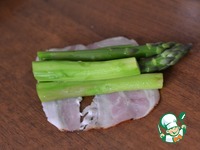 Спаржу разрезать пополам. Выкладываем по 4 штуки спаржы на полоску бекона. |
