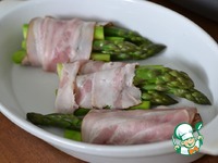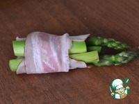 Завернуть спаржу беконом, оставляя верхушки спаржи неприкрытыми. |