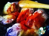 Добавить 2 ч. л. сладкой паприки. Смотрите по вкусу. Может достаточно будет одной ложки. Перемешать, протушить около минуты, следите, чтобы паприка не пригорела. |