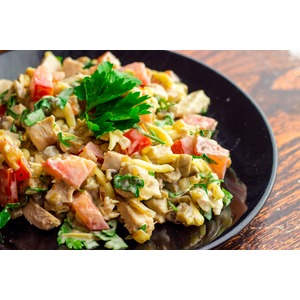 Описание: Простой рецепт очень вкусного куриного салата с шампиньонами и помидорами. Салат очень сытный и готовится очень легко.