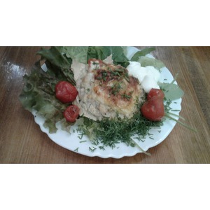 Ну и конечно же украшаем большим количеством зелени с собственного огорода и любимым соусом. К таким котлеткам гарнир не нужен. Они совмещают в себе гарнир и мясное. Приятного аппетита!! |