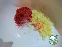 Делаем соус. Перетираем мелко порубленный чеснок, аджику и соль (по вкусу). У меня сухая аджика. |
