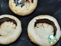 Чайной ложкой или специальным гаджетом удалить ножку и немного мякоти. Главное, не повредить шляпку. Выложить шляпки в жаропрочную форму. |