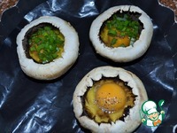 В каждую шляпку вылить яйцо, посолить. Добавить лук. |