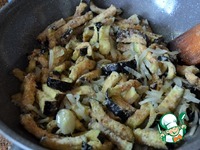 Лук обжарен до прозрачности, влить оставшееся масло, разогреть. Выложить баклажаны. Жарить 5-7 минут на среднем огне, изредка перемешивая. |