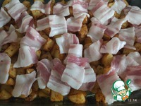 Через полчаса достать картофель из духовки и выложить сверху бекон. Духовку убавить до 200 градусов и отправить запекаться еще на 15-20 минут. |