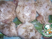 Окорочка промыть, обсушить и натереть солью, перцем и рубленым чесноком. |