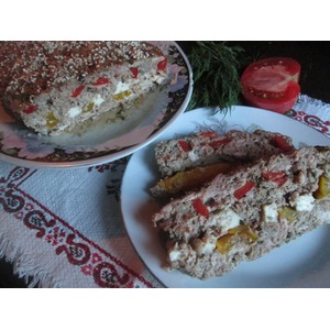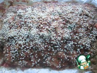 На красный перец выложить оставшийся фарш, разровнять, посыпать кунжутом и выпекать при 200 градусах минут 40-50. Готовая запеканка станет плотной и из нее будет выделяться прозрачный мясной сок. |
