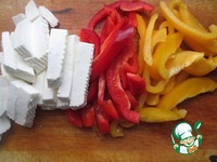 Перцы очистить от семян, порезать длинными ломтиками, сыр нарезать тонкими брусочками. Лук и петрушку измельчить. |