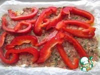 Выложить сверху еще одну треть фарша, разровнять, и распределить на ней красный перец. |