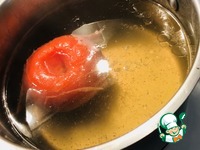 Поставить воду на плиту для нагрева. Помидор слегка надрезать кожицу, опустить в горячую воду и немного поварить. |