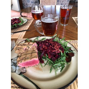 Описание: Тунец на гриле - деликатесное, изысканное и камерное блюдо особенного дня. Огни вечернего города, столик на двоих у окна, задумчивый джаз, отблески двух свечей на бокалах с выдержанным красным терпким вином, и две белоснежные тарелки на такой же скатерти послужат достойным фоном тунца с легким запахом дыма, в грильной сеточке. Я приготовил его недавно на обед для троих. Очень хорошо с пивом пошло. Прекрасно сочетается с салатом из запеченной свеклы, инжира и вяленых помидоров с орехами, базовый рецепт которого увидел шурин по телевизору, я доработал специально для тунца и, в итоге, вы можете прочитать в публикации "Свекольный салат на аругуле" на Поваренке.