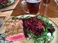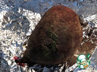 Время приготовления этого блюда определяется свеклой, поэтому я выделил ее готовку в отдельный предварительный шаг. Вообще говоря, лучше всего подготовить свеклу накануне, потому что ей еще остывать после запекания. Включаем духовку на 220 Цельсия. Обрезаем вершки и корешки. Заворачиваем корнеплод в фольгу. Забрасываем в духовку. Через час проверяем зубочисткой или любым другим острым предметом, вплоть до вязальной спицы. Мягкая? Готова. Достаем, даем остыть. Нет? Заворачиваем обратно и опять в духовку до готовности. |