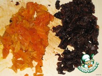 Курагу и чернослив залить горячей водой на 5-10 минут, в зависимости от свежести. Обсушить и порезать, раздельно. |
