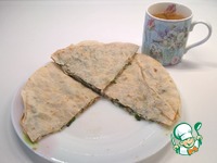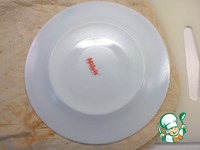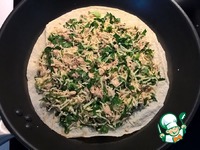 Кладем первый круг на сухую сковороду и равномерно распределяем по нему начинку, немного отступая от края. |