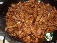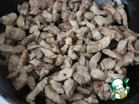 Мясо очистить от пелен, жил, костей и нарезать соломкой. Раскалить 2 ст. ложки масла на сковороде и обжарить мясо в 2 приема до румяной корочки. |