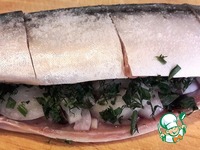 Укроп мелко нарезать. Добавляем его к луку в брюшко. Скумбрию посолить. |