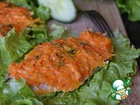 Салат превращается в шубку для курицы))) Куриное филе посолить, поперчить, выложить в жаропрочную посуду (при необходимости посуду смазать маслом). Морковно-сырный салат выложить на филе. |
