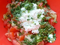 Всё просто: овощи и зелень вымыть, обсушить, нарезать. Добавить зерненый творог, соль, молотый черный перец. |