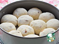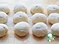 Подошедшее тесто выложить на рабочую поверхность, присыпанную мукой, обмять, разделить на 12-14 равных частей. Из каждой сформировать шарик - булочку. |
