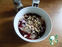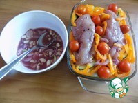 Полила маринадом вместе с чесноком и луком. Верх сбрызнула ещё 1 ст л оливкового масла. |