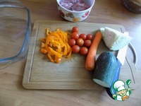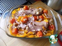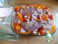 Форму смазала 1 ст л оливкового масла. Выложила филе и овощи слоями: морковь-капуста-кабачок (цукини)-филе грудки-перец болгарский и черри положила во все свободные места. |