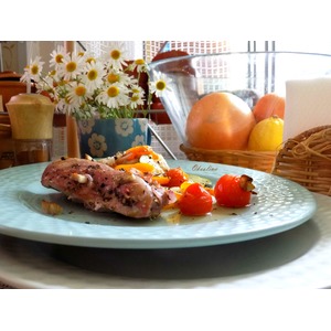 Описание: Куриная грудка, замаринованная в гранатовом соке и запечённая с овощами ассорти в духовке. Сочная, и в сочетании с овощами, необыкновенно ароматная и вкусная. Диетическое блюдо и полезное.