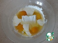 Для теста растопите сливочное масло. Добавьте сметану и кефир, перемешайте. Добавьте яйца и творог, снова перемешайте. |
