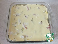 В смазанную форму вылейте половину теста и уложите начинку из кусочков картофеля, соцветий цветной капусты и долек помидора. Посыпьте сухими ароматными травами по вкусу. |