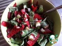 Описание: Придумала салат случайно и на ходу. В минувшие выходные вернулись мы с дачи, холодильник почти пустой, из продуктов только то, что привезли в качестве первого урожая - ревень, щавель, мята... Основное блюдо благо у нас было, а к нему хотелось какого-нибудь легкого салатика. Поскребла по сусекам, разобрала сумки - вот и нашлись ингредиенты. Салат получился очень свежим, кисло-сладким, отлично подходит к мясу. Уже повторяла его на неделе и точно буду готовить еще!