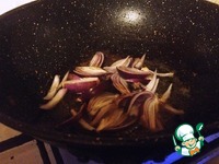 Лук очистить, нарезать перьями. Обжарить в воке на доставшемся масле помешивая 1-2 минуты. |