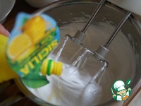 3 яичных белка взбиваем до устойчивых пиков добавляя понемногу оставшийся сахар, затем добавляем крахмал и лимонный сок, еще раз взбиваем. |