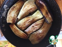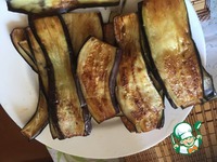 Для начала нарезать пластами баклажаны, шириной миллиметров 5-8, не тонко. Вымочить их минут 20 в подсоленной воде и обжарить с двух сторон. |