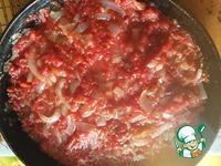 Лук выложить поверх фарша, распределить и залить сверху стаканом томата или парой перетертых помидор. |