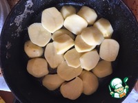 Тем временем почистить картофель, порезать кругляшками, тоже не тонко и плотно выложить на дно формы, немного посолить. |