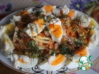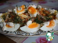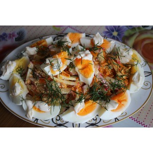 Яйца очистить, нарезать на 4 дольки. Выложить по краям блюда и сверху. На каждую дольку капнуть немного майонеза. Украсить салат нарезанным укропом. |