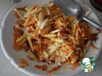 Смешать редис с морковью и 1,5 столовой ложкой майонеза. Выложить в центр блюда. |