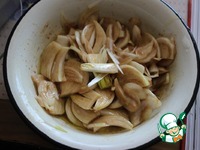 Выкладываем жареные грибы. У меня зимняя заготовка, последняя баночка. Если нет готовых, то придется жарить. |