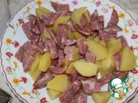 Нарезаем толстенькими полосками колбасу. Выкладываем на блюдо к картофелю. |