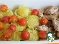 С помидоров снять кожицу, выложить картофель и помидоры к бедрам. |