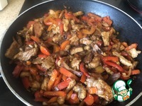 Когда мясо обжарилось, добавляем сначала лук, обжариваем вместе, затем болгарский перец, затем чеснок и постоянно помешиваем. |