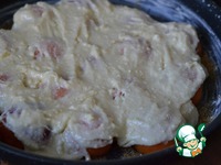 Ложкой выкладываем тесто на абрикосы. Делаем все не торопясь, старательно прикрыть тесто поверхность абрикосов. |